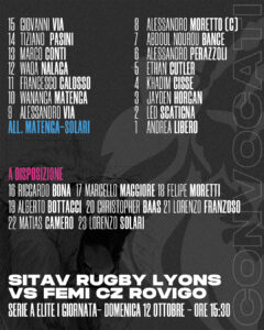 Piacenza, Stadio “W. Beltrametti” – domenica 5 ottobre ore 12.30 Under 18 – Barrage Qualificazione Emilbanca Rugby Lyons v Amatori Union Milano 34-15 (17-10) Emilbanca Rugby Lyons: Anelli, Del Fiol, Locca, Barbieri (cap), Pagliafora; Petrusic, Isola; Konte, Mutti, Binati; Galuzzi, Tizzoni; Fontanella, Dodici, Montesissa A disposizione: Lombardi, Sula, Rizzi, Manfredi, ...