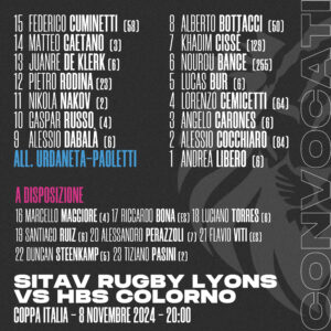 Colorno, Stadio “Paolo Pavesi” – 2 novembre 2024 ore 18.00 Serie B – IV giornata PuntoPack Colorno v Sitav Rugby Lyons 19-8 (6-8) Marcatori: p.t. 14’ cp Pasini (3-0), 22’ cp Russo (3-3), 33’ m Bart Cobbah (3-8), 36’ cp Pasini (6-8) s.t. 59’ m Fusi tr Pasini (13-8), 62’ ...