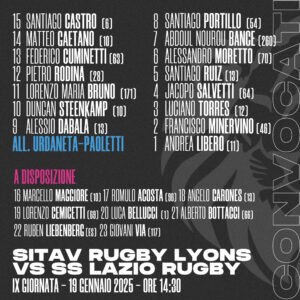 Roma, “CPO” Giulio Onesti – Sabato 19 Gennaio 2025 Serie A Elite, – IX giornata S.S. Lazio Rugby 1927 v Sitav Rugby Lyons 20-26 (20-14) Marcatori: p.t. 12’ m. Baffigi (5-0), 28’ m. Baffigi tr Cozzi (12-0), 30’ m. Castro tr Steenkamp (12-7), 33’ m. Perez Boulan (17-7), 37’ cp Bianco Mat. (20-7), 39’ ...