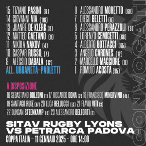 Piacenza, Stadio “Walter Beltrametti” – 11 gennaio 2025 ore 14.00Coppa Italia – V Giornata Sitav Rugby Lyons v Petrarca Rugby Padova 7-42 (7-35)Marcatori: p.t. 7’ m Ghigo tr Lyle (0-7), 12’ m Lyle tr Lyle (0-14), 17’ m Coppo tr Lyle (0-21), 20’ m Trotta tr Lyle (0-28), 24’ m ...