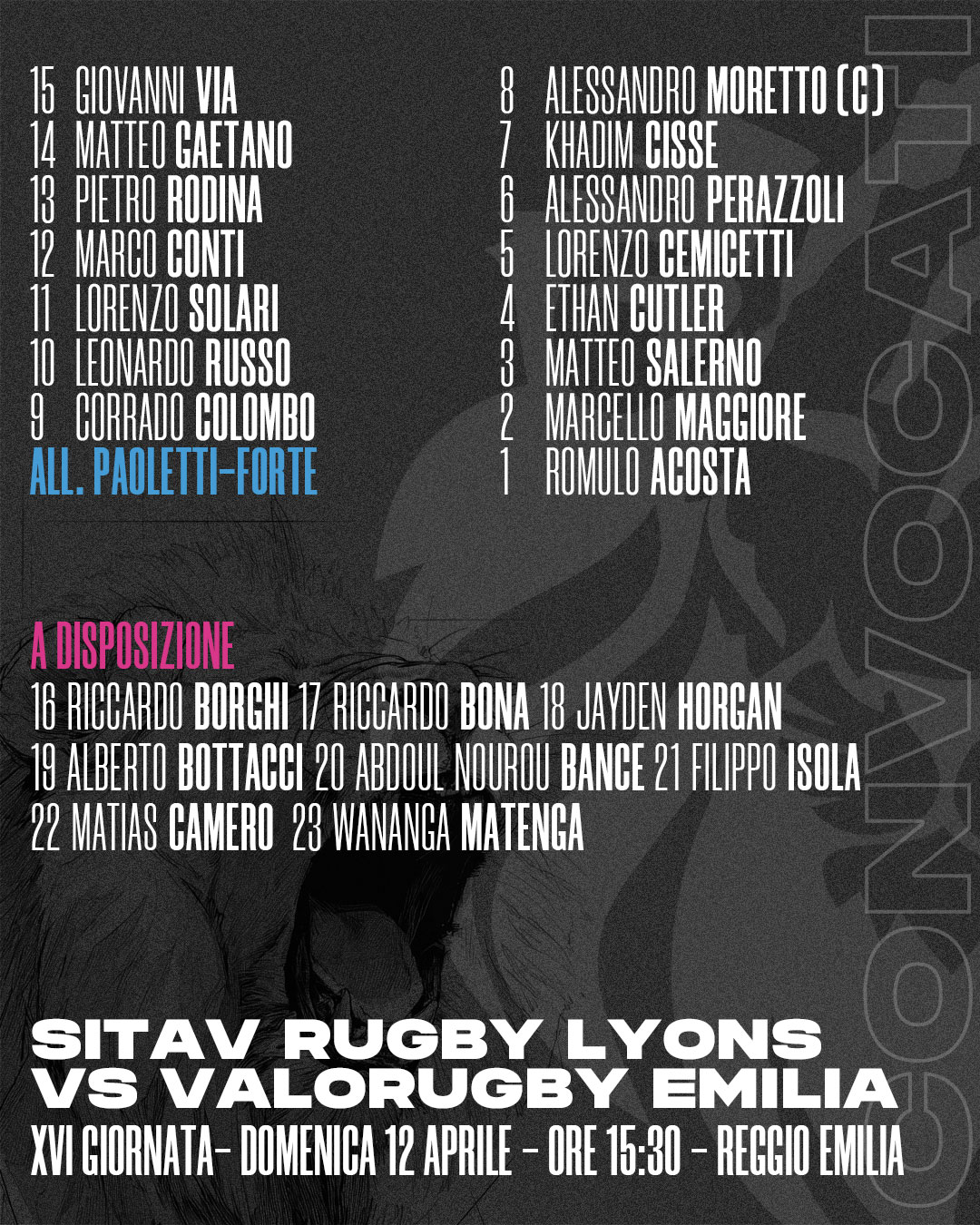 A livello di formazione, lo staff bianconero dà spazio a qualche rotazione per dare minutaggio a tutti gli effettivi e ai rientranti da infortuni come Conti e Cissè. Situazione delicata in prima linea, con Libero squalificato per il cartellino rosso rimediato con Mogliano e gli infortuni di Scatigna e Bolzoni tra i tallonatori: spazio dunque a Bona e Borghi, richiamati dalla squadra cadetta e pronti a giocarsi le proprie carte alle spalle di Maggiore e Acosta, che accompagnano Matteo Salerno alla prima da titolare in stagione. Nuova convocazione per il giovanissimo Filippo Isola, dopo l’esordio di Padova il 18enne piacentino partirà dalla panchina anche a Reggio Emilia, mentre tra i titolari si rivede Lorenzo Solari dopo l’infortunio patito a inizio stagione e le ottime prestazioni dell’ultimo mese con la squadra cadetta.