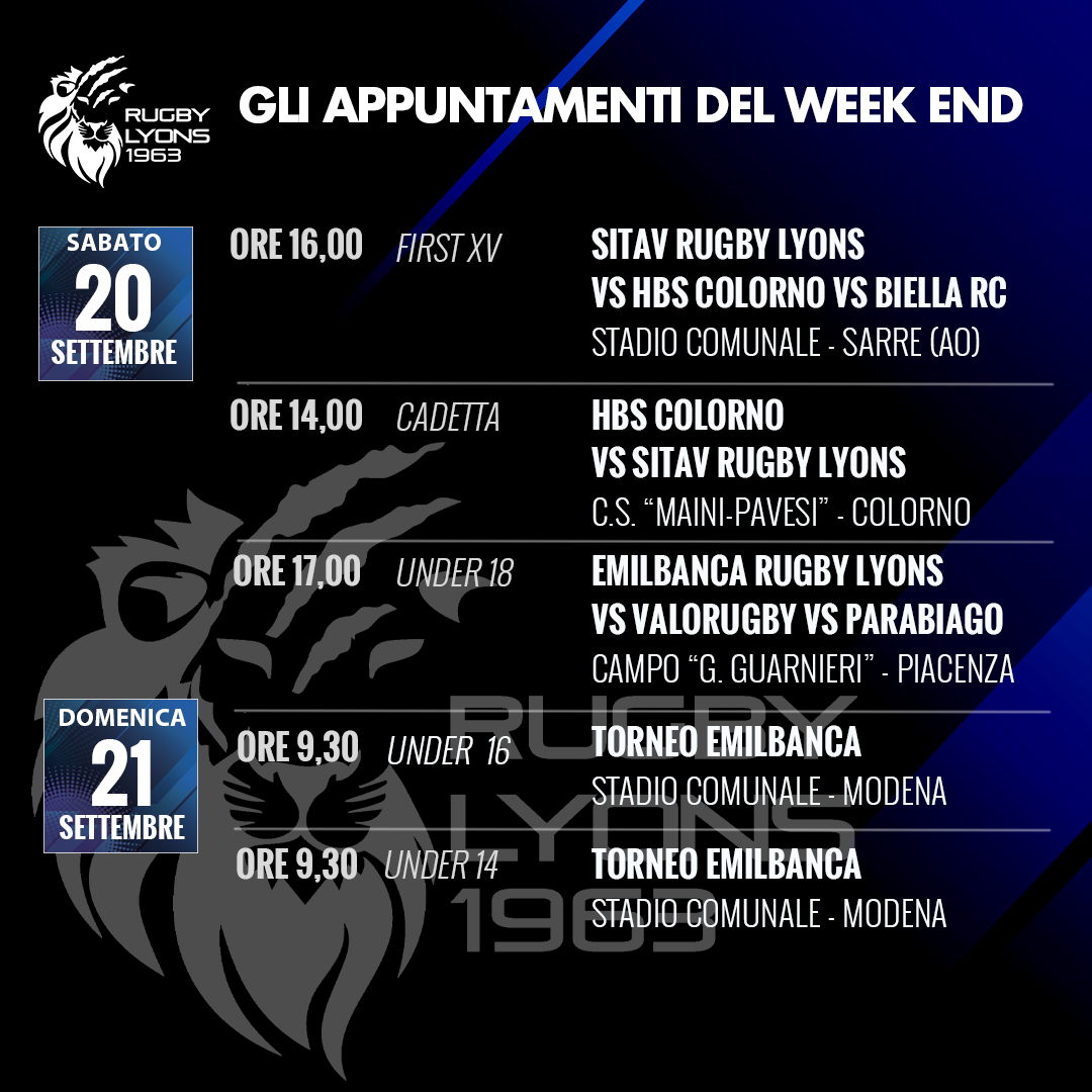 Sabato sarà anche il giorno dell’Under 18, a caccia di conferme dopo l’ottima prova messa in campo domenica scorsa a Parabiago. Stavolta i giovani leoni ospiteranno presso la sede Lyons lo stesso Parabiago e il Valorugby Emilia, per un triangolare che si annuncia di alto livello. Calcio d’inizio alle ore 17.00 presso il campo “Guarnieri” di via Rigolli.